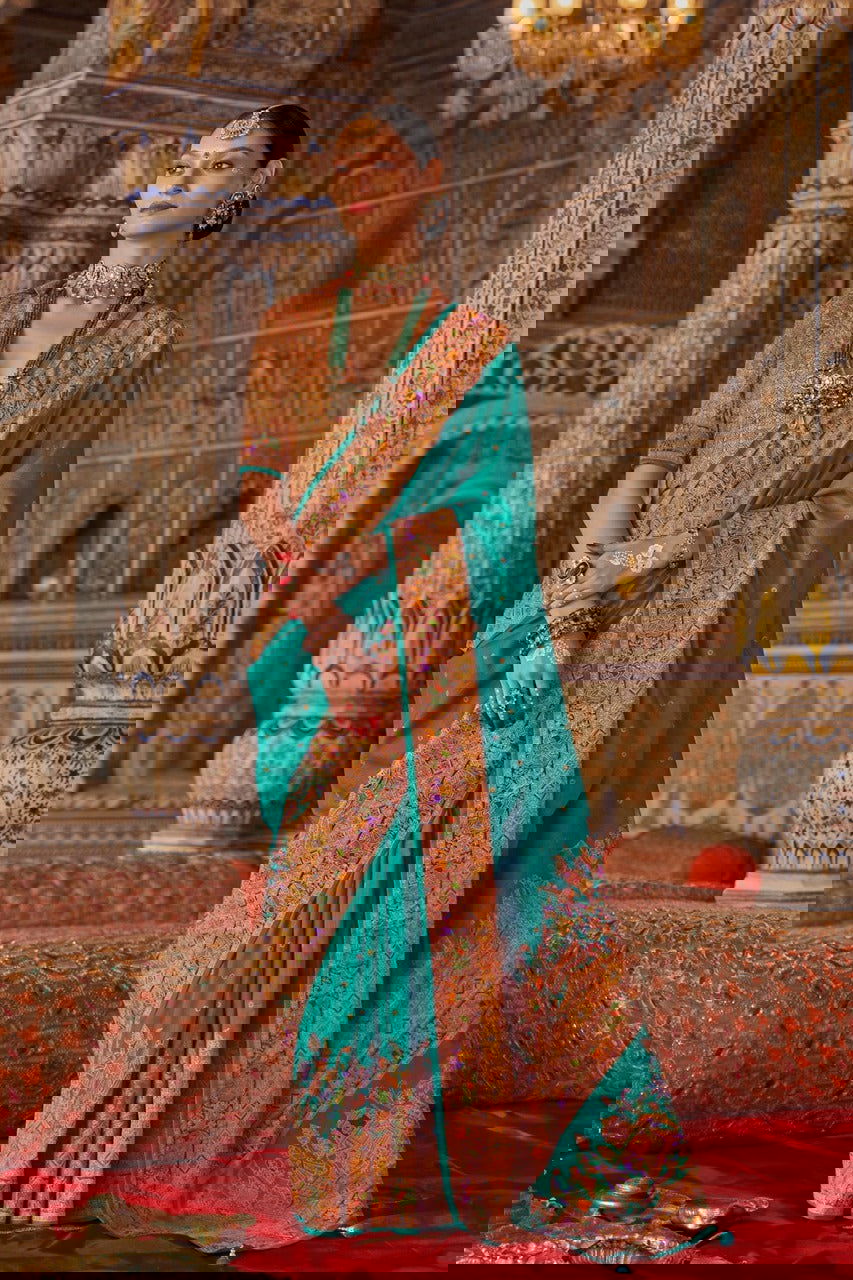 Aqua Blue Green Raw Silk Saree with Heritage Prints