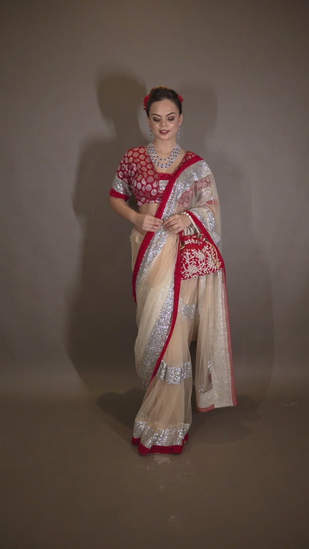Ivory Golden Net Saree with Intricate Sequin Detailing and Velvet Border