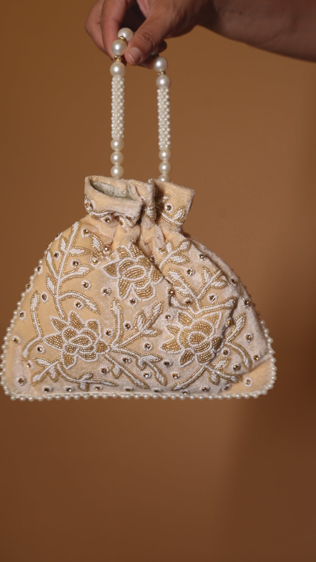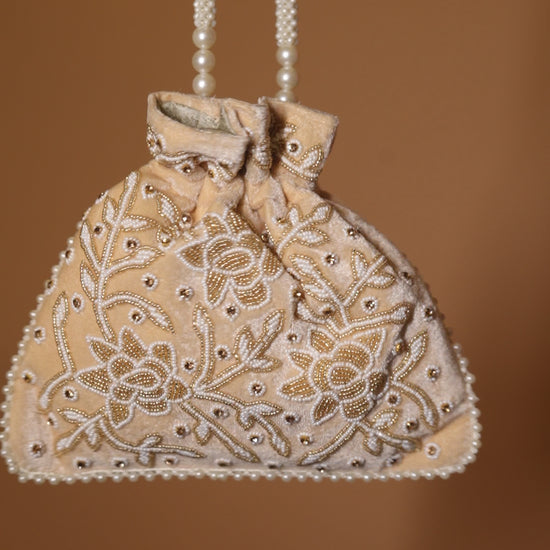 Handwork Beige Pearl and Bead Potli with Pearl Handle and Velvet Base