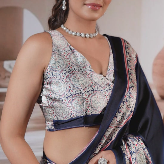 Black Pure Satin Modal Silk Saree with Ajrakh Print