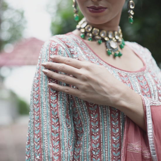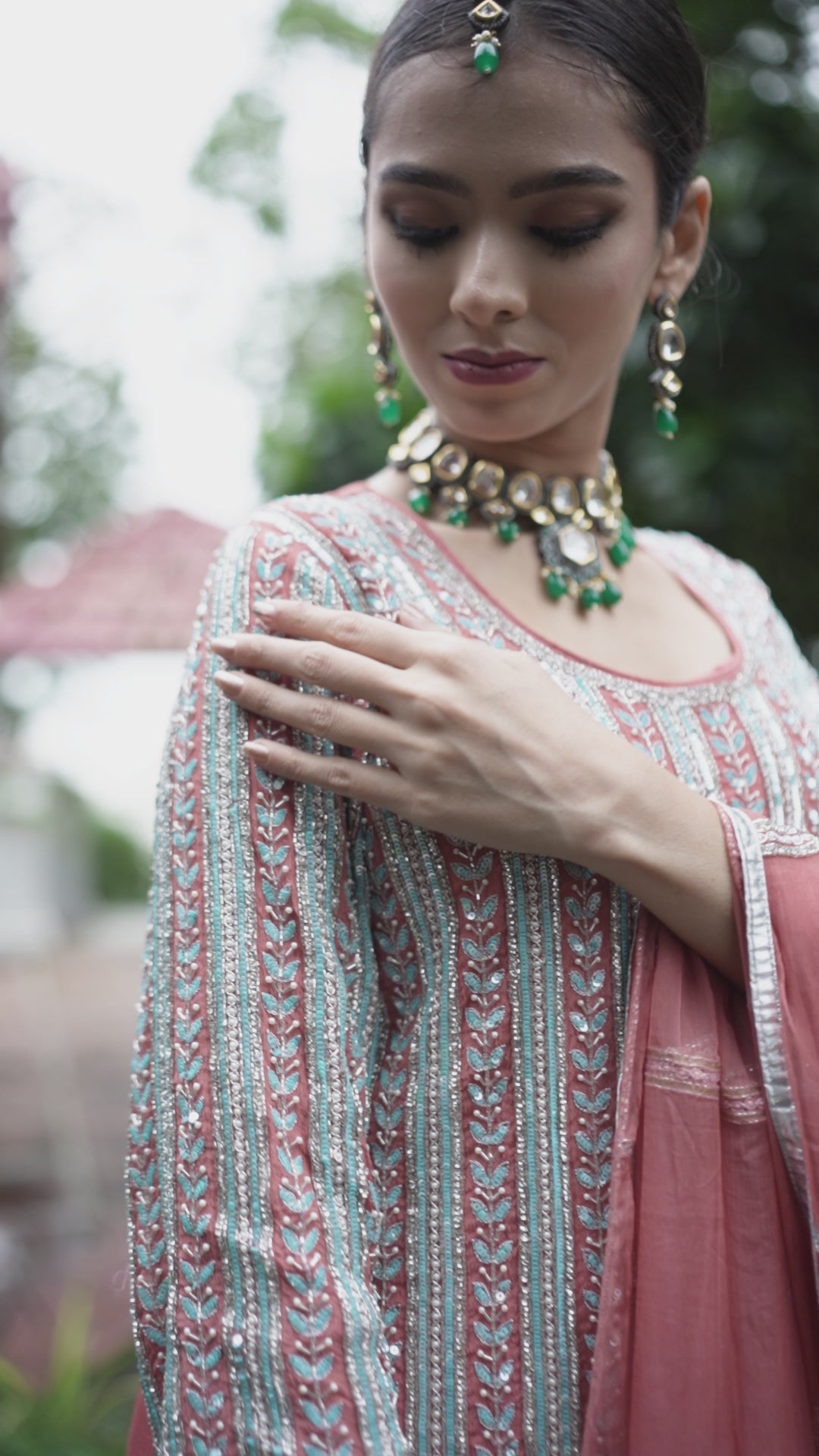 A perfect fusion of elegance and heritage, this Rust Brown Sharara Suit is crafted from luxurious georgette fabric, detailed with hand-done zardozi and sequin embroidery. The set features a graceful knee-length kurta with full sleeves and a flattering V-neck, paired with a flowing georgette sharara and a matching dupatta, making it ideal for festive and formal occasions.