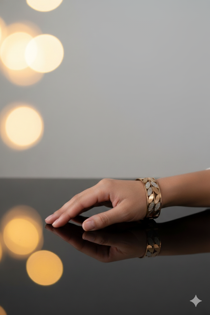 A nature-inspired bracelet featuring an elegant leaf design, beautifully cast in rose gold and accented with subtle shimmer — perfect for adding a touch of grace to any look.