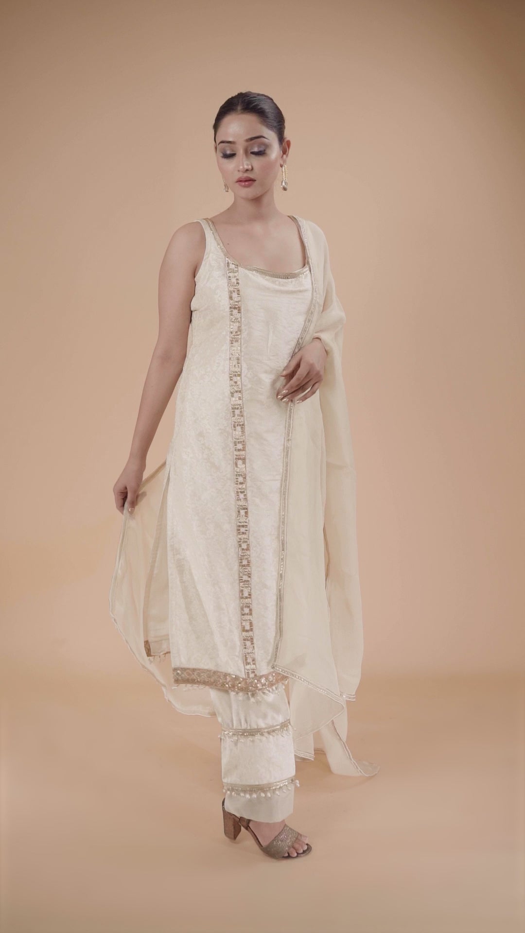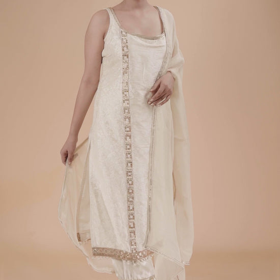 Grace meets glamour in this stunning Ivory White Brocade Suit, designed for modern elegance with a traditional twist. The sleeveless kurta features delicate lace accents, while the matching brocade palazzo pants are elevated with playful hanging tassels—a perfect blend of charm and sophistication. Ideal for festive occasions, daytime events, or elegant soirées.