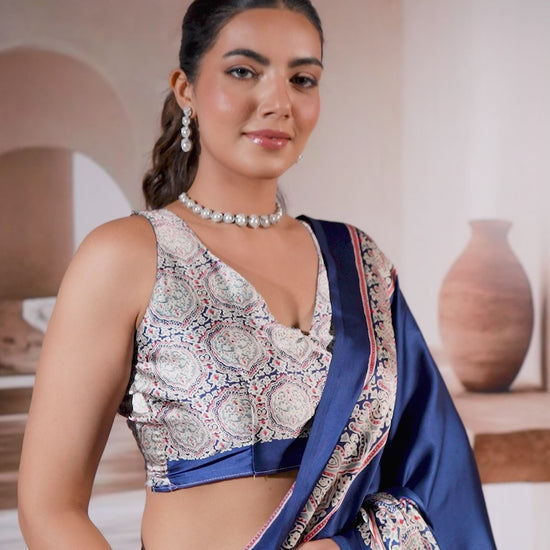 Highlight: Dark navy blue satin modal silk saree with authentic Ajrakh print, combining artisanal heritage and contemporary sophistication.