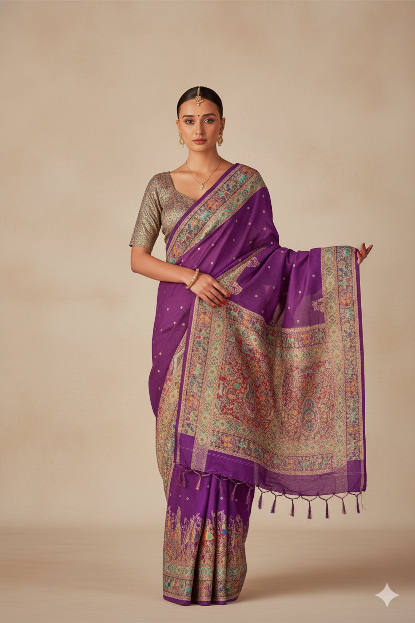 This richly hued purple raw silk saree showcases exquisite craftsmanship with a majestic all-over peacock motif. The pallu and border are adorned with detailed, historically inspired prints, adding a regal charm to their traditional appeal. Ideal for weddings, cultural celebrations, or festive gatherings, this saree radiates elegance and ethnic beauty.