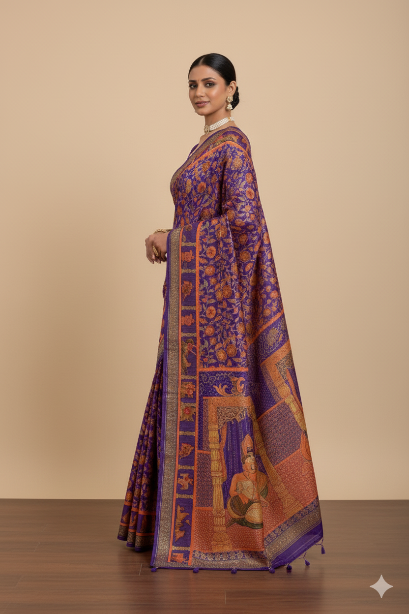 Graceful and rich, this purple viscose silk saree showcases ethnic heritage prints beautifully blended with exclusive embellishments. The lustrous silk fabric drapes effortlessly, offering a regal yet comfortable silhouette—perfect for weddings, traditional functions, and cultural gatherings.