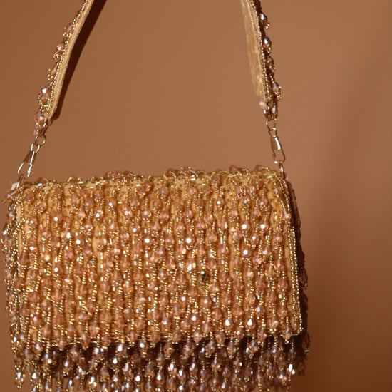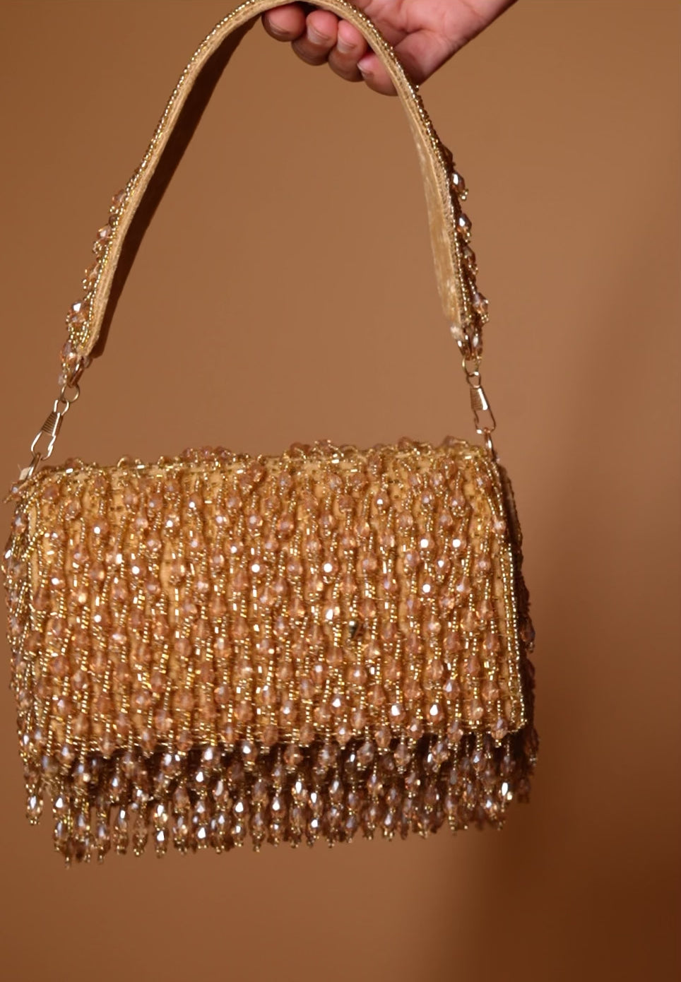 The luxurious golden beige velvet clutch adorned with intricate beadwork and tassels creates a sophisticated yet playful look. Perfect for adding a stylish touch to any occasion, this clutch exudes elegance and charm.