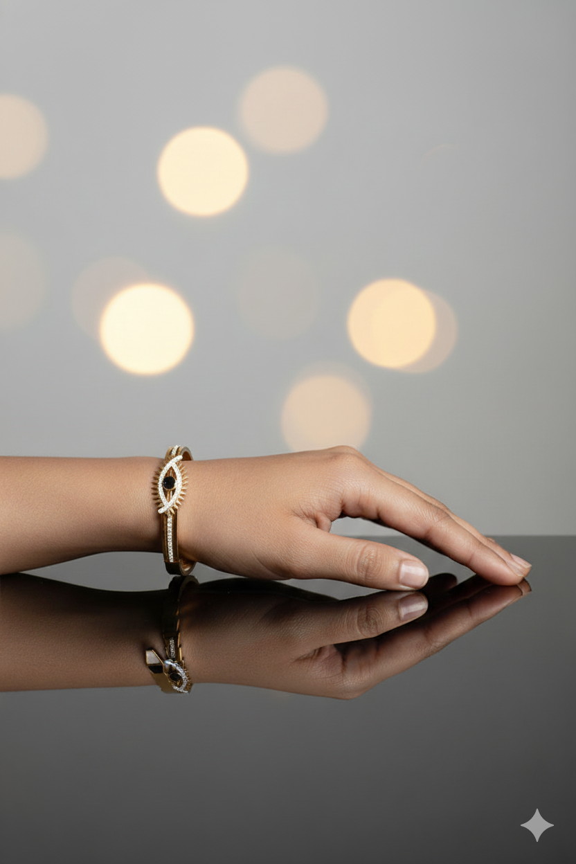 Add a dash of protection and sparkle to your look with this Golden Evil Eye Bracelet, designed with shimmering Star Cut American Diamonds and a sleek link lock closure. The iconic evil eye charm wards off negativity while the premium anti-tarnish plating ensures long-lasting shine.