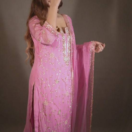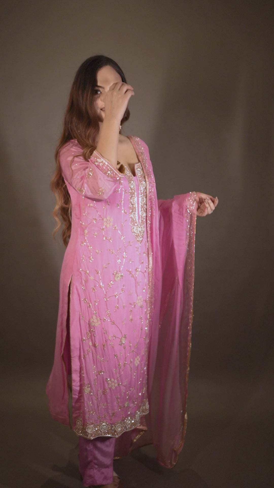 A delicate and graceful Baby Pink Georgette Suit, featuring heavy overall embroidery with intricate Pipe, Swarovski, and Pearl work. This ensemble is perfectly paired with matching straight crape pants and a detailed Georgette dupatta, making it a charming pick for festive or formal occasions.
