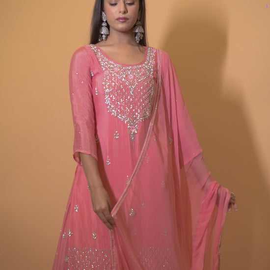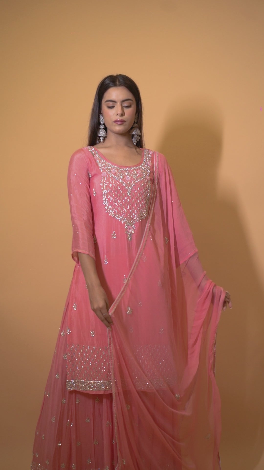 A timeless Peach Georgette Sharara Suit, intricately handcrafted with heavy Swarovski diamond embroidery. The ensemble features a knee-length heavily embroidered kurta, paired with a matching Swarovski-embellished designer sharara and a detailed georgette dupatta for a graceful finish.