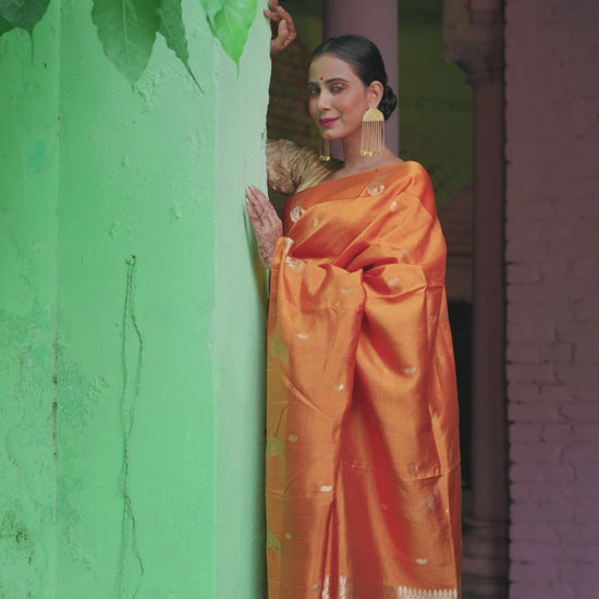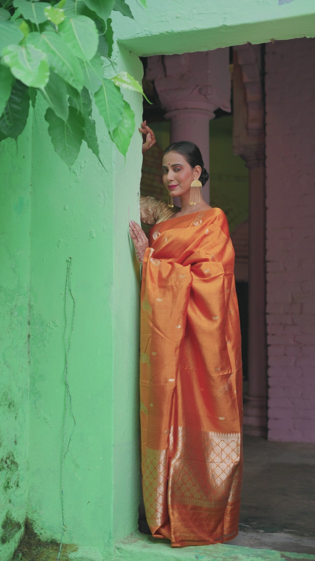 This handloom saree in radiant saffron yellow is woven from pure Katan silk, featuring intricate Kadwa Booti and floral antique motifs. A perfect blend of heritage and luxury, it captures the timeless charm of Banarasi craftsmanship.