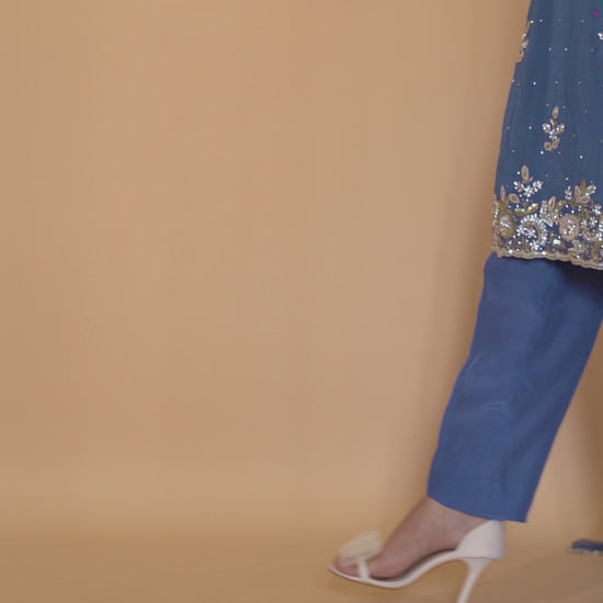An exquisite piece blending traditional handcraft with modern elegance. This Dark Gray Blue Chiffon Suit features Heavy Zardozi, Swarovski, and Sequin Work, offering a luxurious and radiant look. Perfect for weddings, receptions, or festive evenings.
