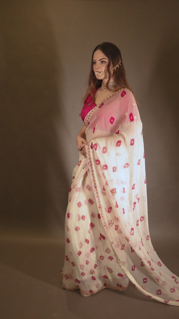 Ivory Cream and Pink Chiffon Saree with Sequin Handwork with Stiched Blouse