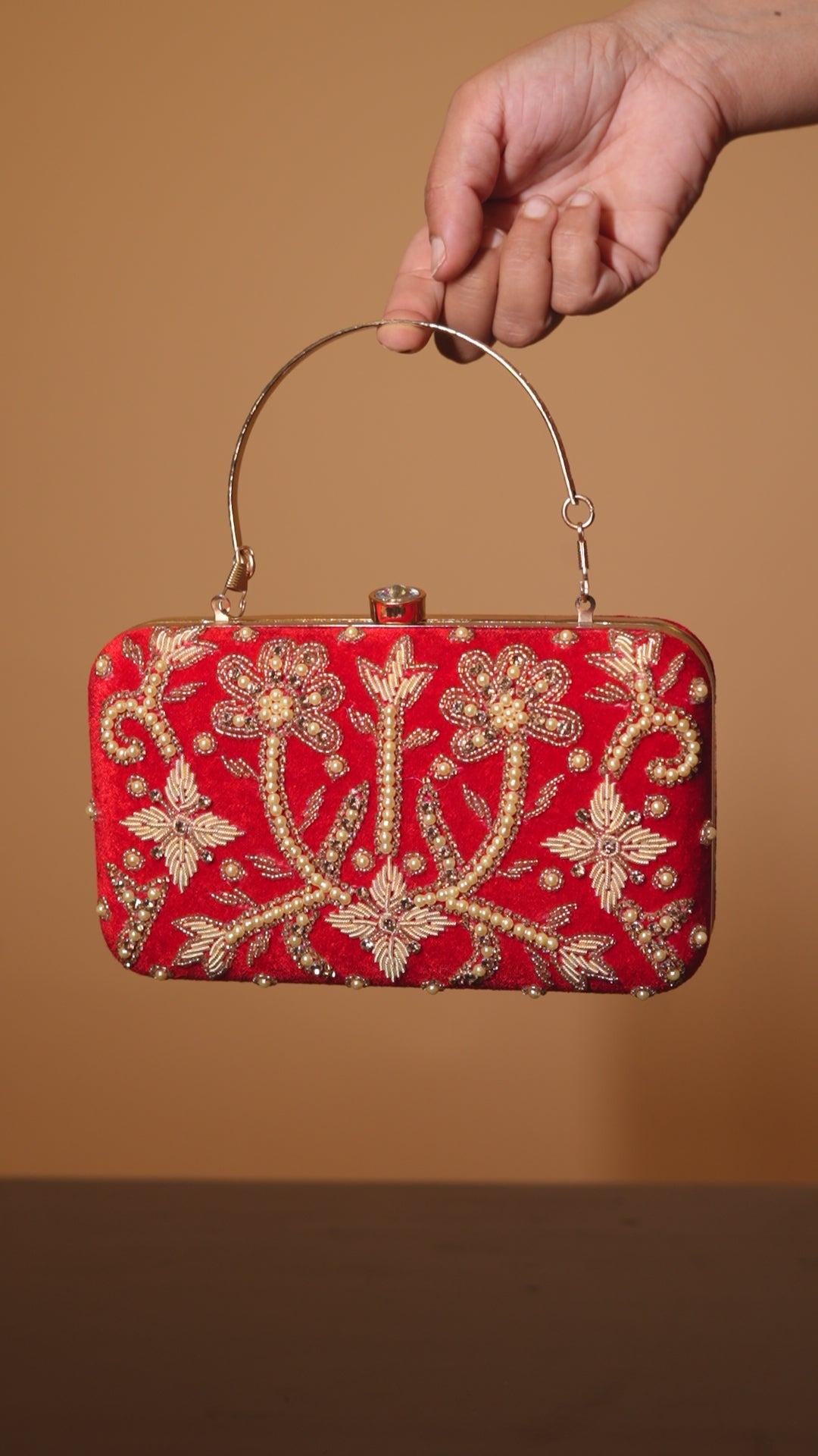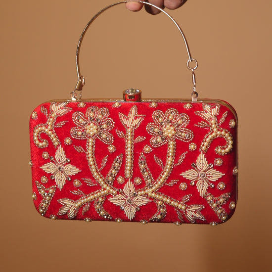 Red Velvet Clutch with Pearl & Zardozi Embroidery – With Handle