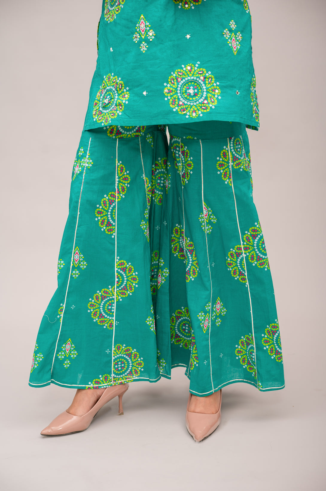 Green Mal Cotton Bandhani Print Sharara Suit with Mirror Embroidery