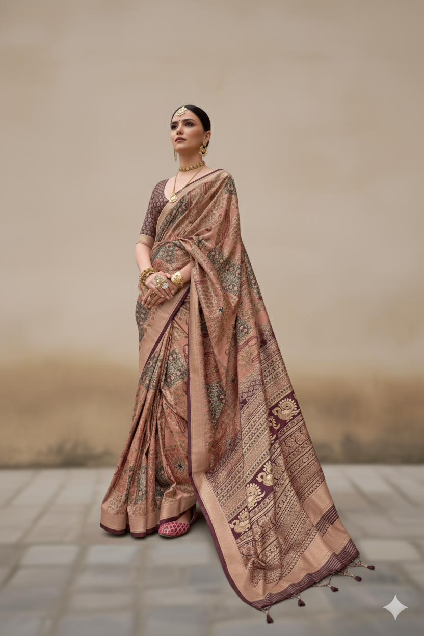 Sophisticated and graceful, this light coffee brown raw silk saree features a luxurious golden satin print and a rich golden border that adds refined elegance. Its soft, flowy texture and warm tone make it a perfect pick for festive events, cultural functions, or formal evening wear.