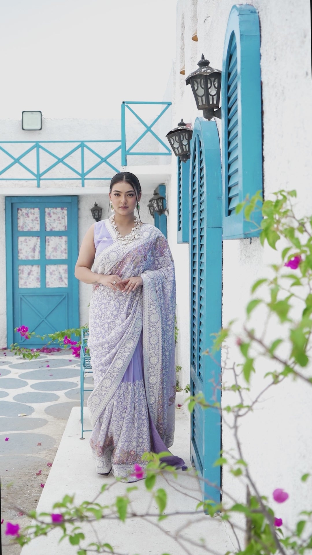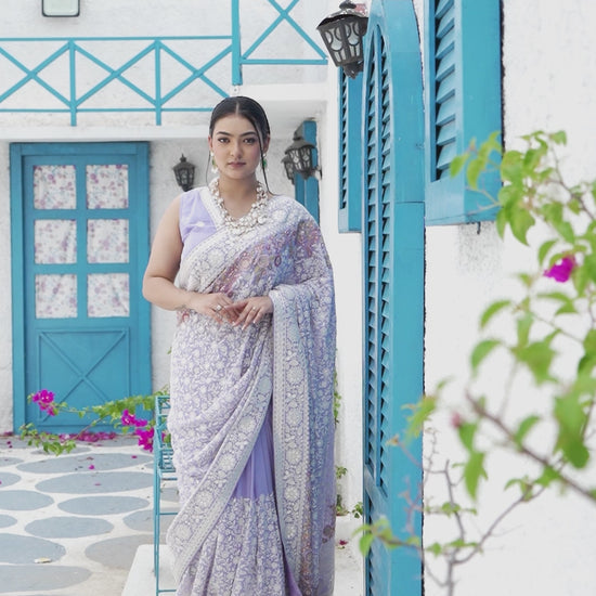 Soft and graceful, this light purple Lucknowi Georgette saree is adorned with delicate zari embroidery and finished with charming tassels on the pallu. Its airy drape and intricate detailing add a touch of understated luxury, making it perfect for weddings, festive celebrations, or special gatherings.