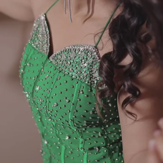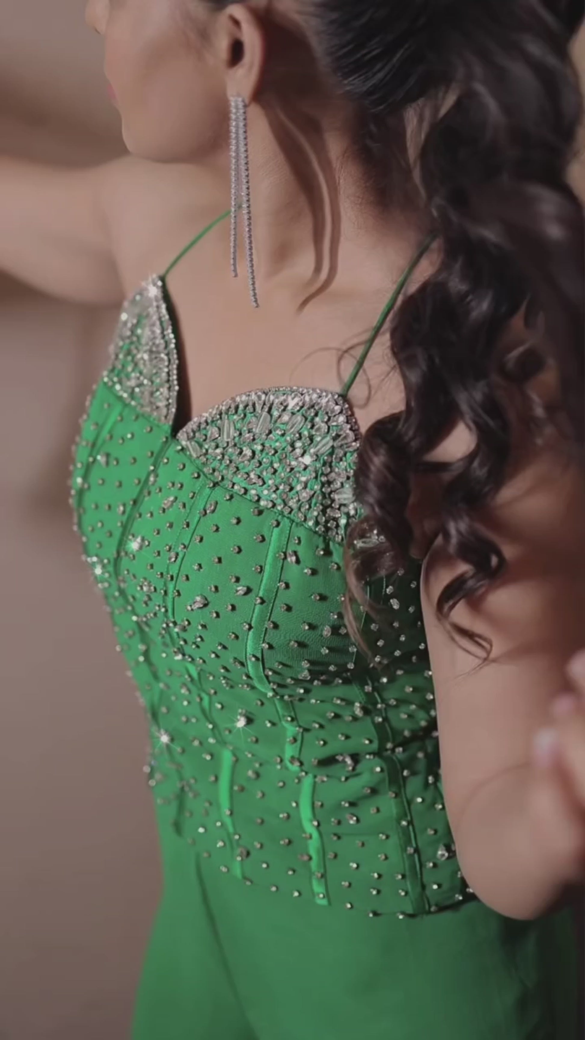 Highlights: Stunning Green Viscose Silk Cord-Set with sparkling stone work, styled with delicate dori straps and paired with a matching potli — a statement outfit that radiates festive elegance and modern sophistication.