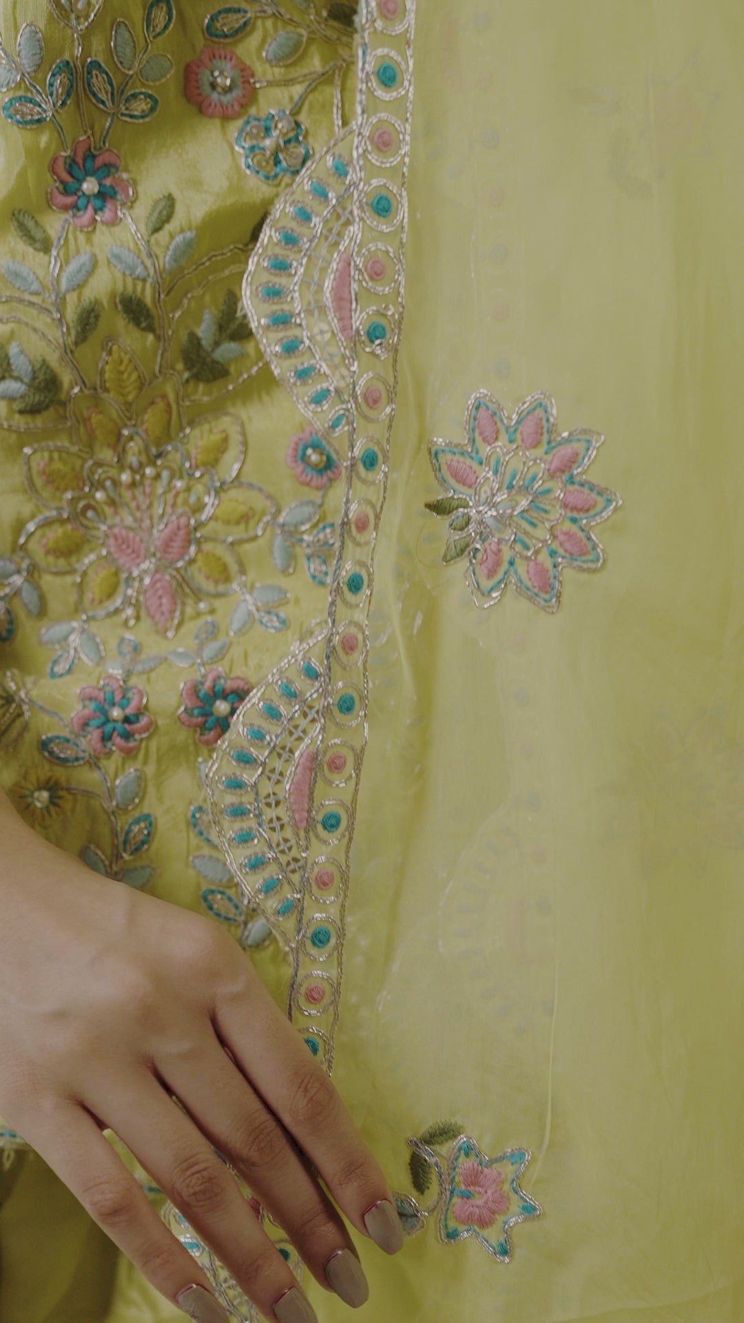 Highlights: Zari, Multi-Color Thread & Pearl Work on Kurta, completed with a Matching Dupatta and Flared Garara