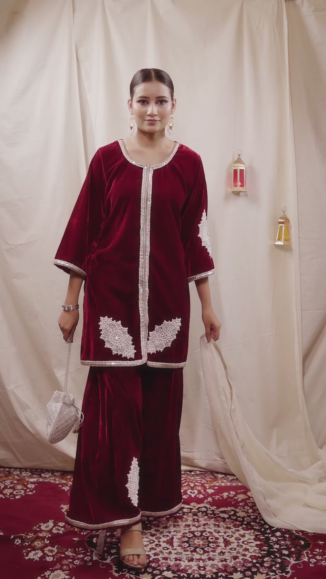 Elegant Maroon Velvet Embroidered Palazzo Set
