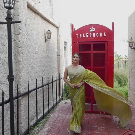 Elegant and captivating, this mehendi green Georgette saree is beautifully embellished with shimmering sequins and intricate zari embroidery. Its lightweight, flowing drape paired with subtle sparkle makes it ideal for festive gatherings, sangeet nights, or wedding functions.