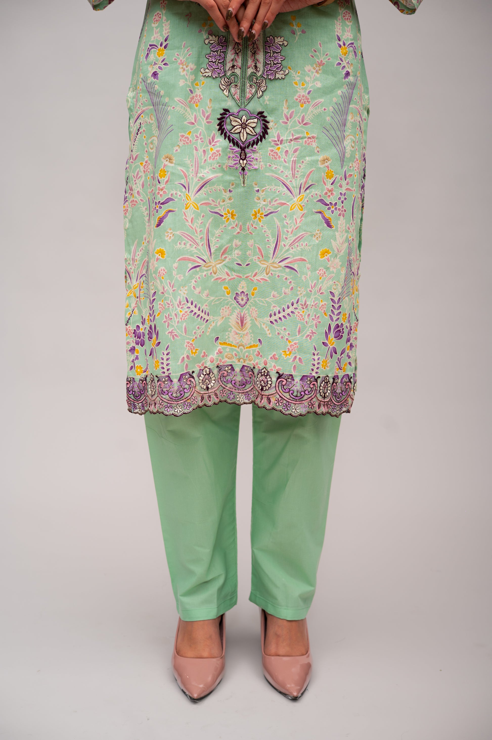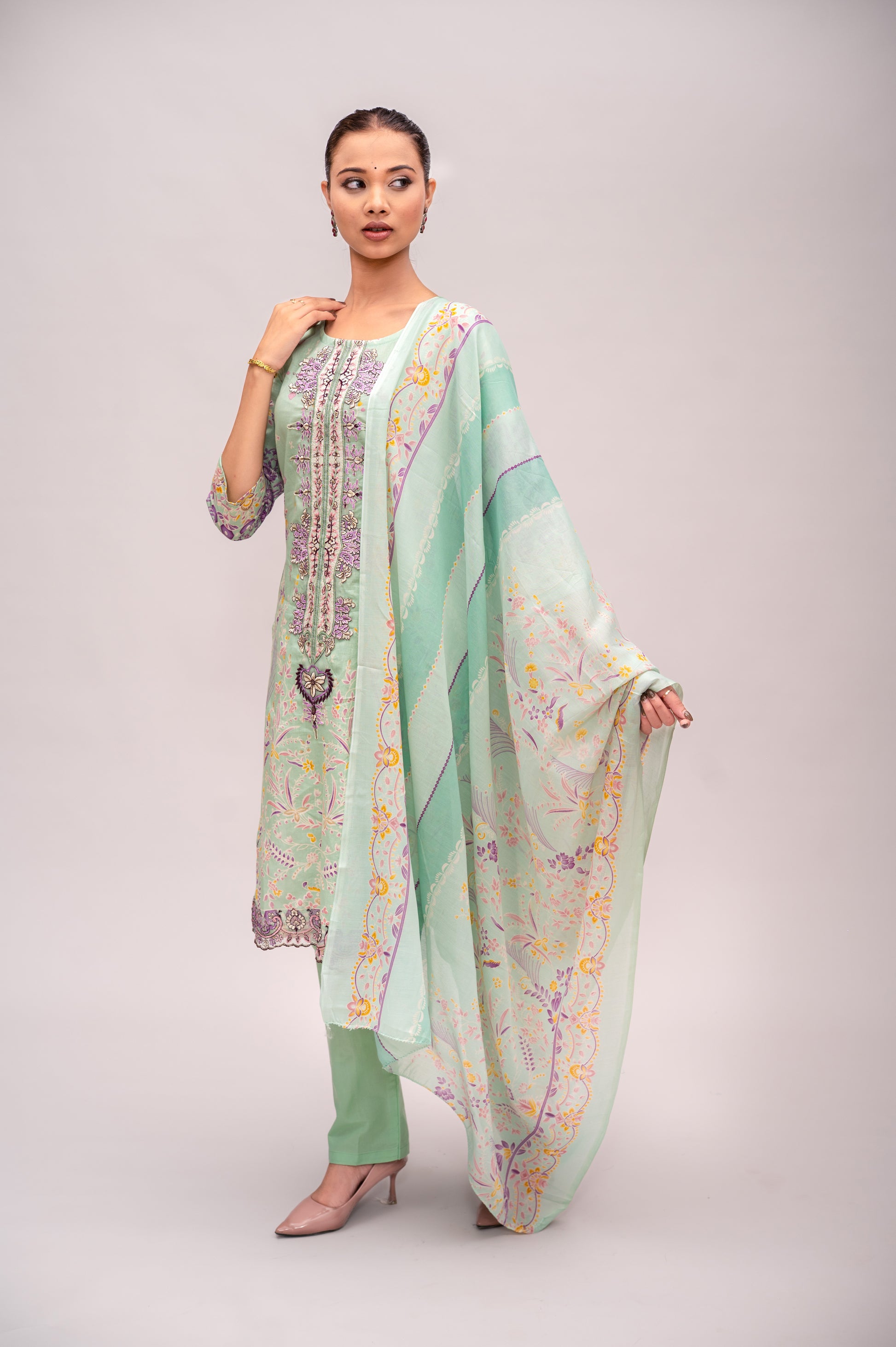 Green Cotton Lawn Suit with Embroidery with a Malmal Printed Dupatta