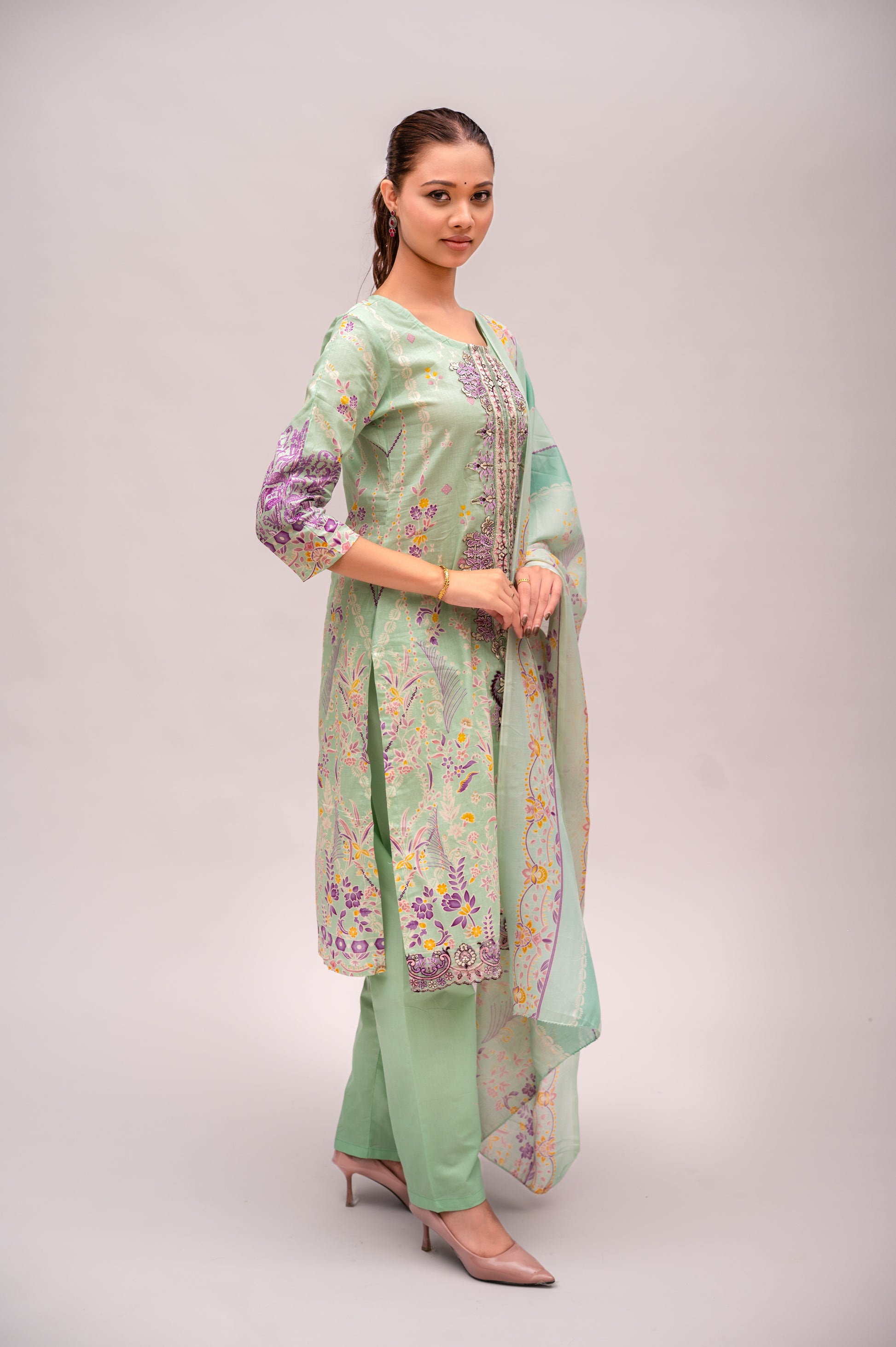Green Cotton Fancy Suit with Heavy Self-Embroidery, Paired with a Malmal Printed Dupatta