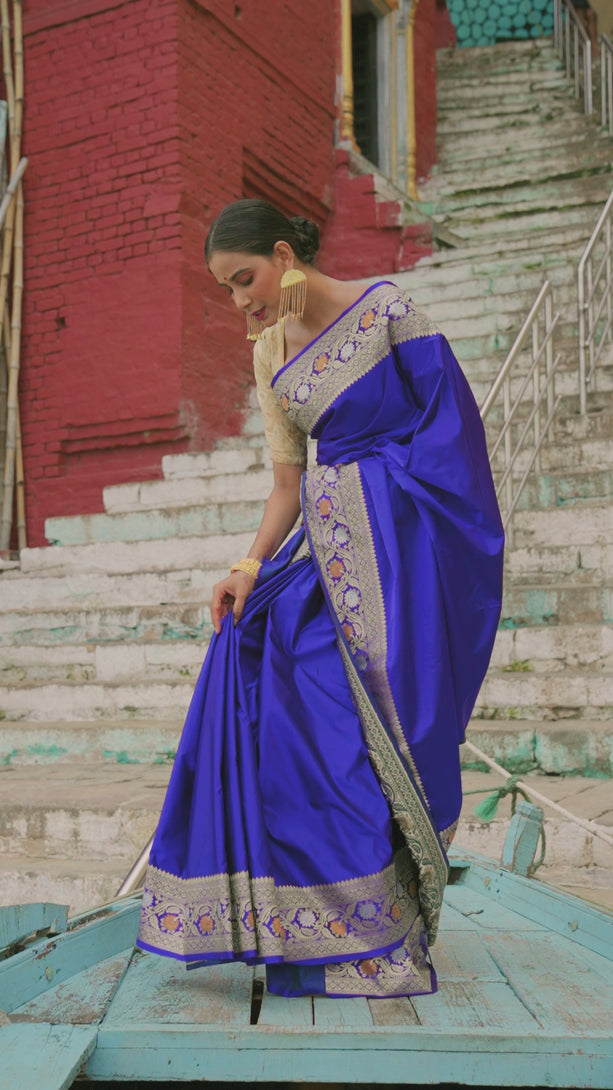 This stunning navy blue Mashru satin silk saree is adorned with exquisite handcrafted multi-color zari work, complemented by a contrast border that enhances its traditional Banarasi charm.
