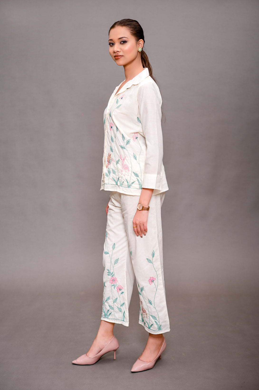 Simple and comfortable, this off white cotton cord set is adorned with subtle green and pink embroidery, adding a hint of freshness to its clean, classic look. Crafted from soft, breathable cotton, it’s ideal for long office hours, casual outings, or everyday wear when you want to stay stylish yet relaxed.
