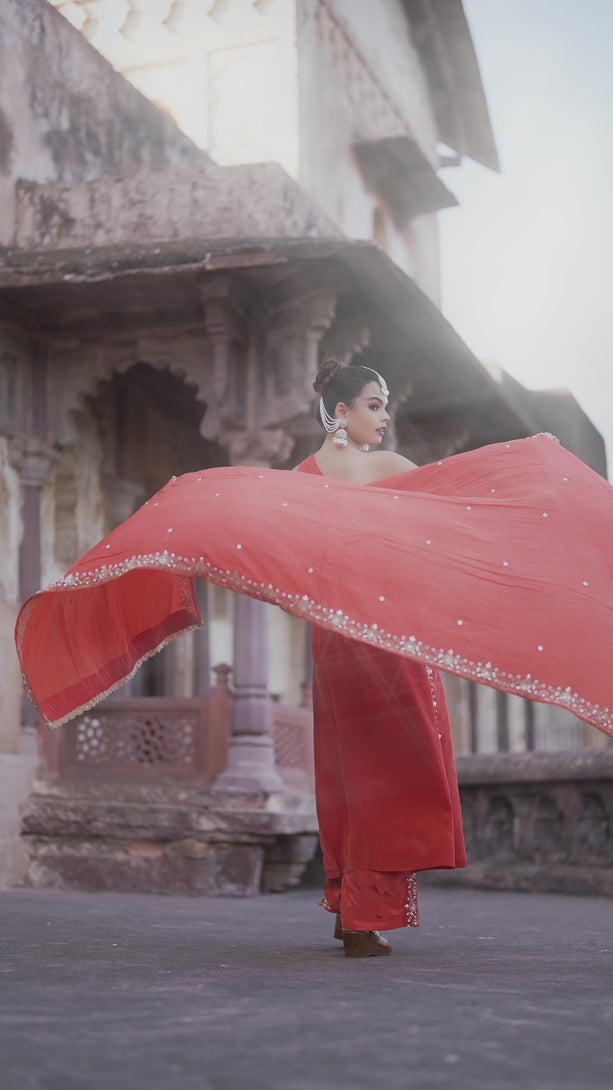 A perfect blend of modern elegance and contemporary charm, this orange off-shoulder kurta pant set is crafted from luxurious crepe silk, offering a soft texture and graceful drape. The kurta features a chic off-shoulder neckline, with delicate bead and sequin accents (enhanced by subtle zari detailing) adding a refined festive shimmer. Paired with tailored pants and an optional coordinated dupatta, this ensemble creates a sleek and sophisticated silhouette ideal for parties, festive celebrations, and special occasions.