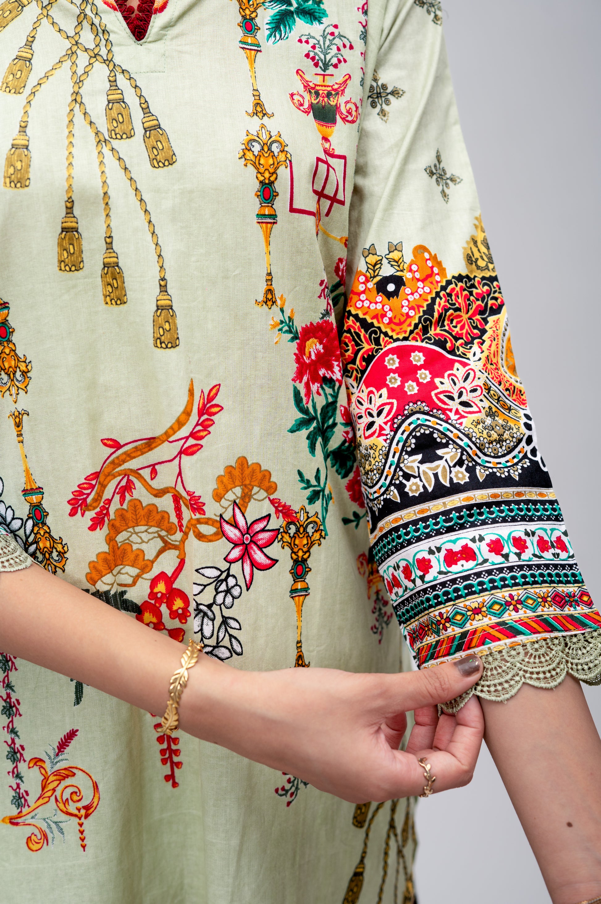 Pastel Green Cotton Suit with Embroidery with a Malmal Printed Dupatta
