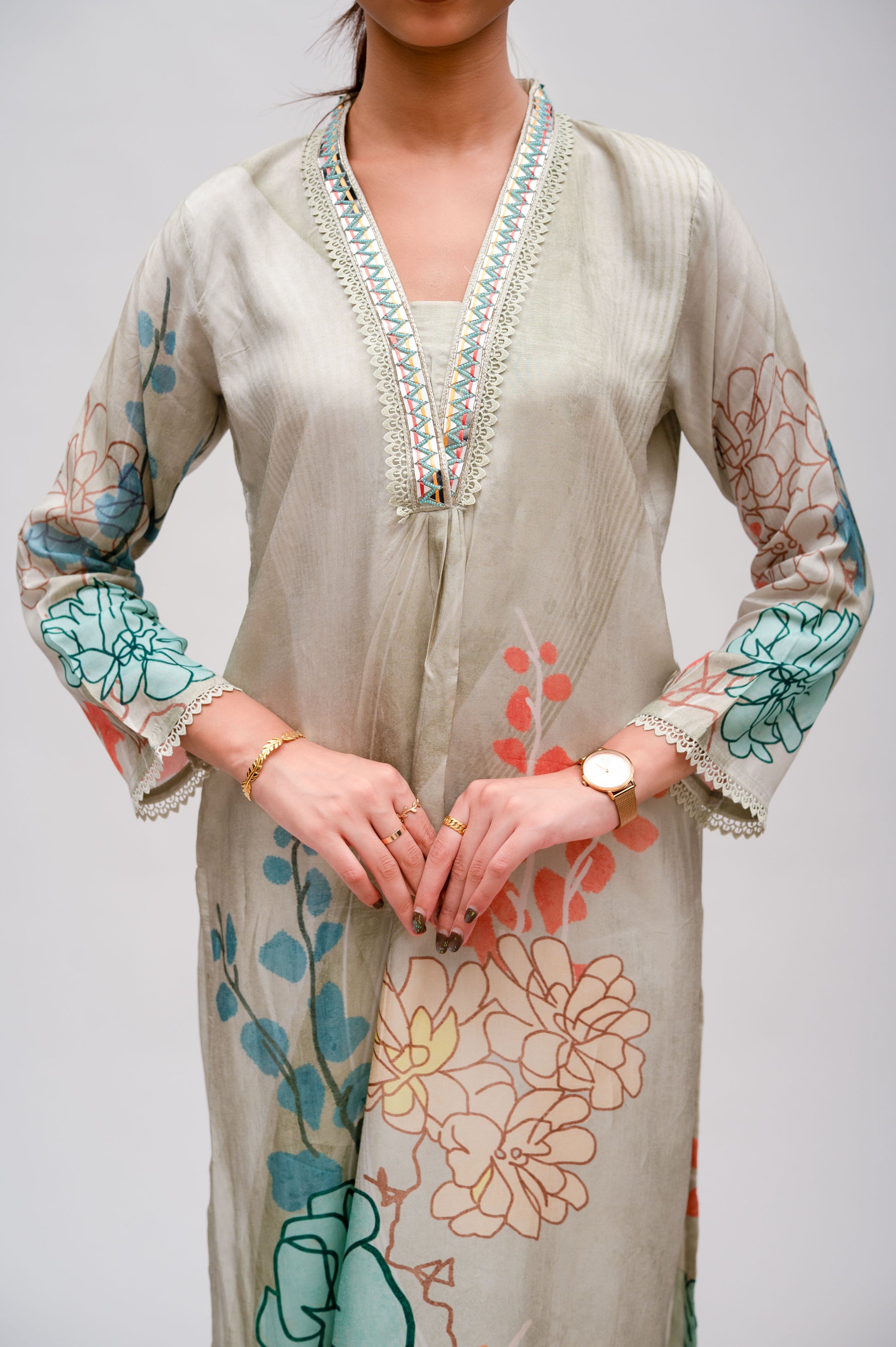 Pastel Green Silk Suit with Pant and Dupatta – Lace and Mirror Embroidery