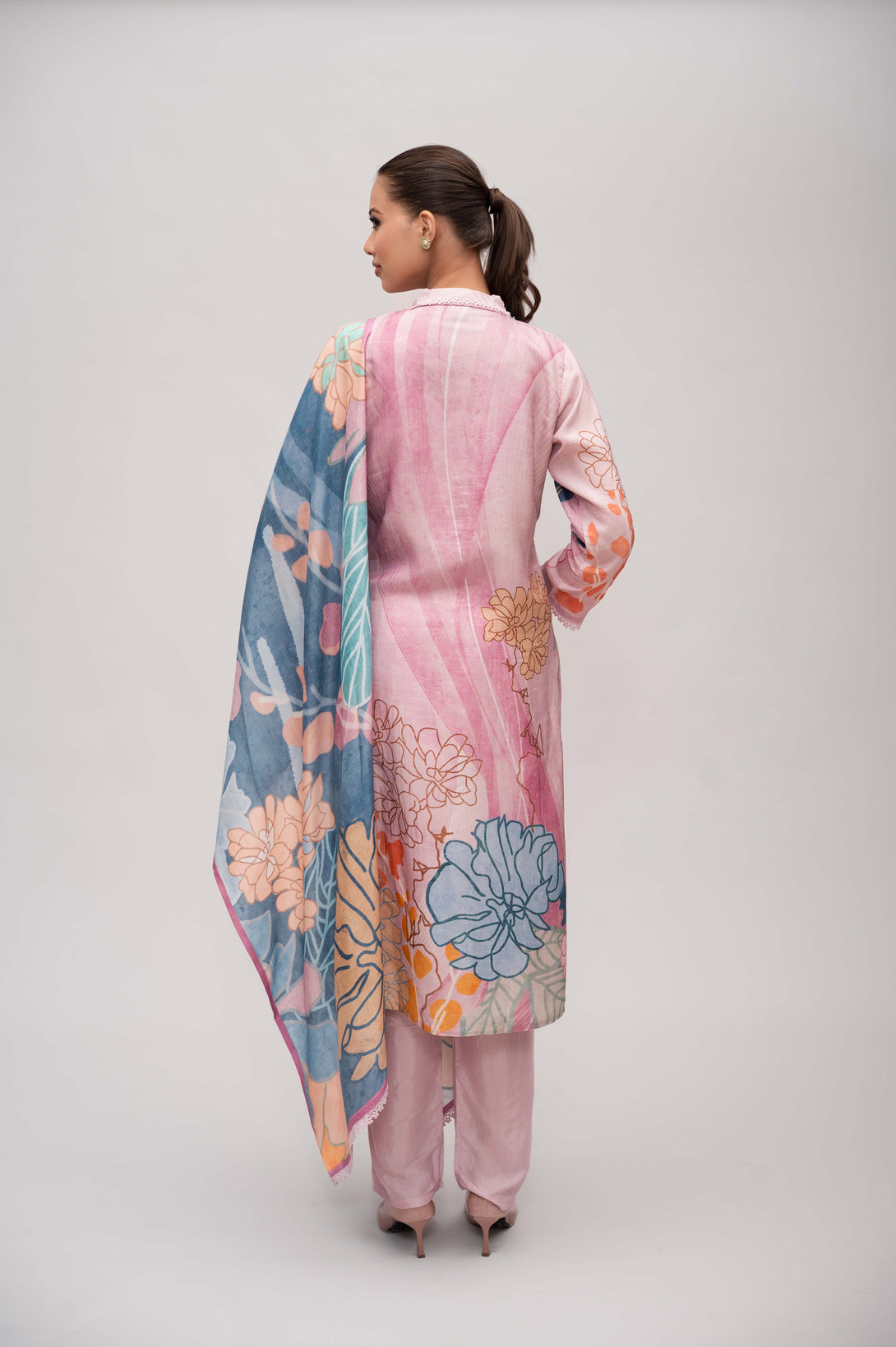 Pastel Pink Silk Suit with Pant and Dupatta – Lace and Mirror Embroidery