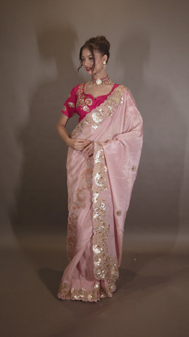 Pastel Pink Saree With Pitta Handwork with Stiched Blouse