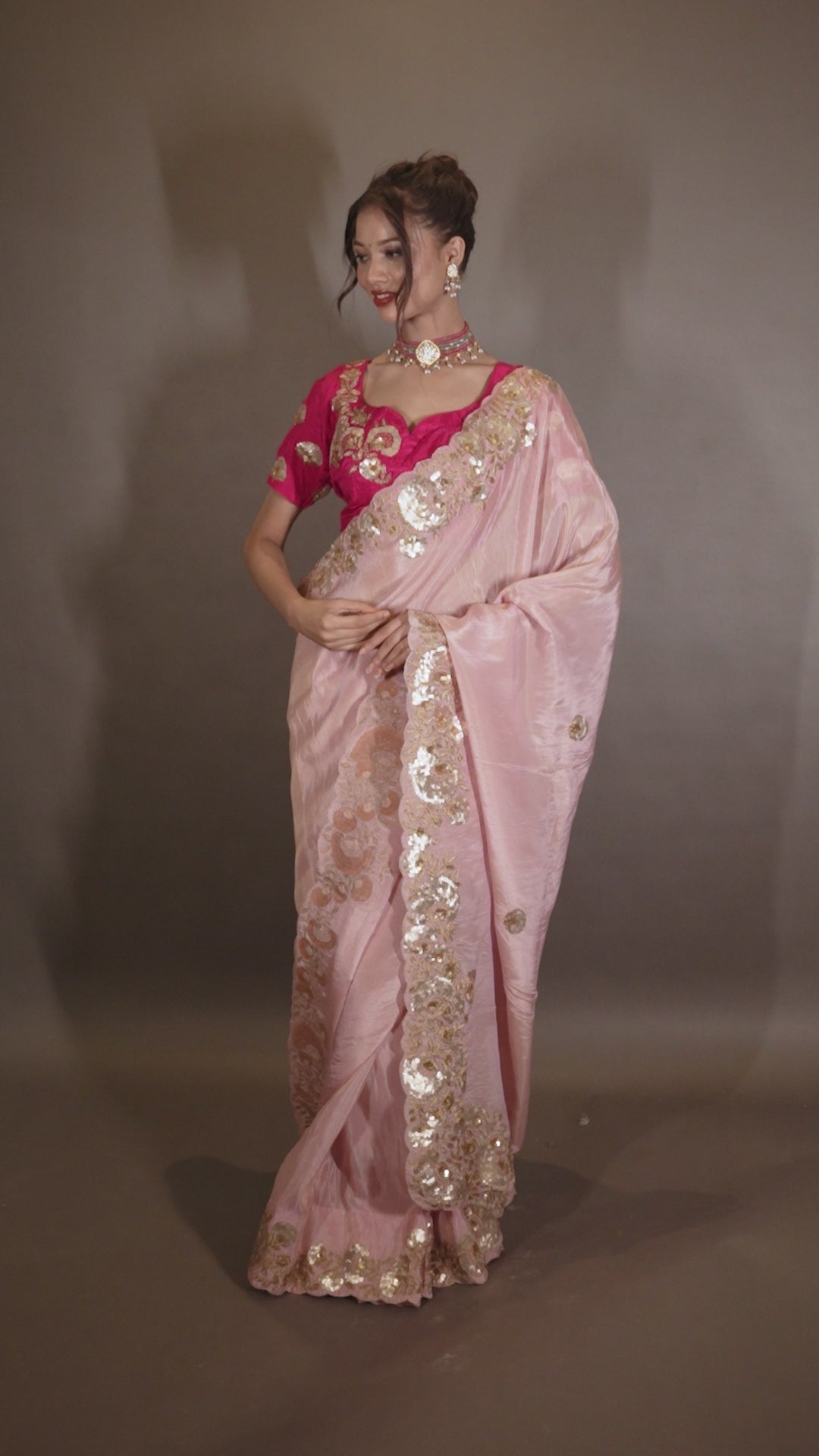 Two Blouse Concept – Rose Pink Crepe Silk Saree with Sequin and Zari Work