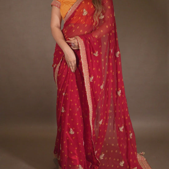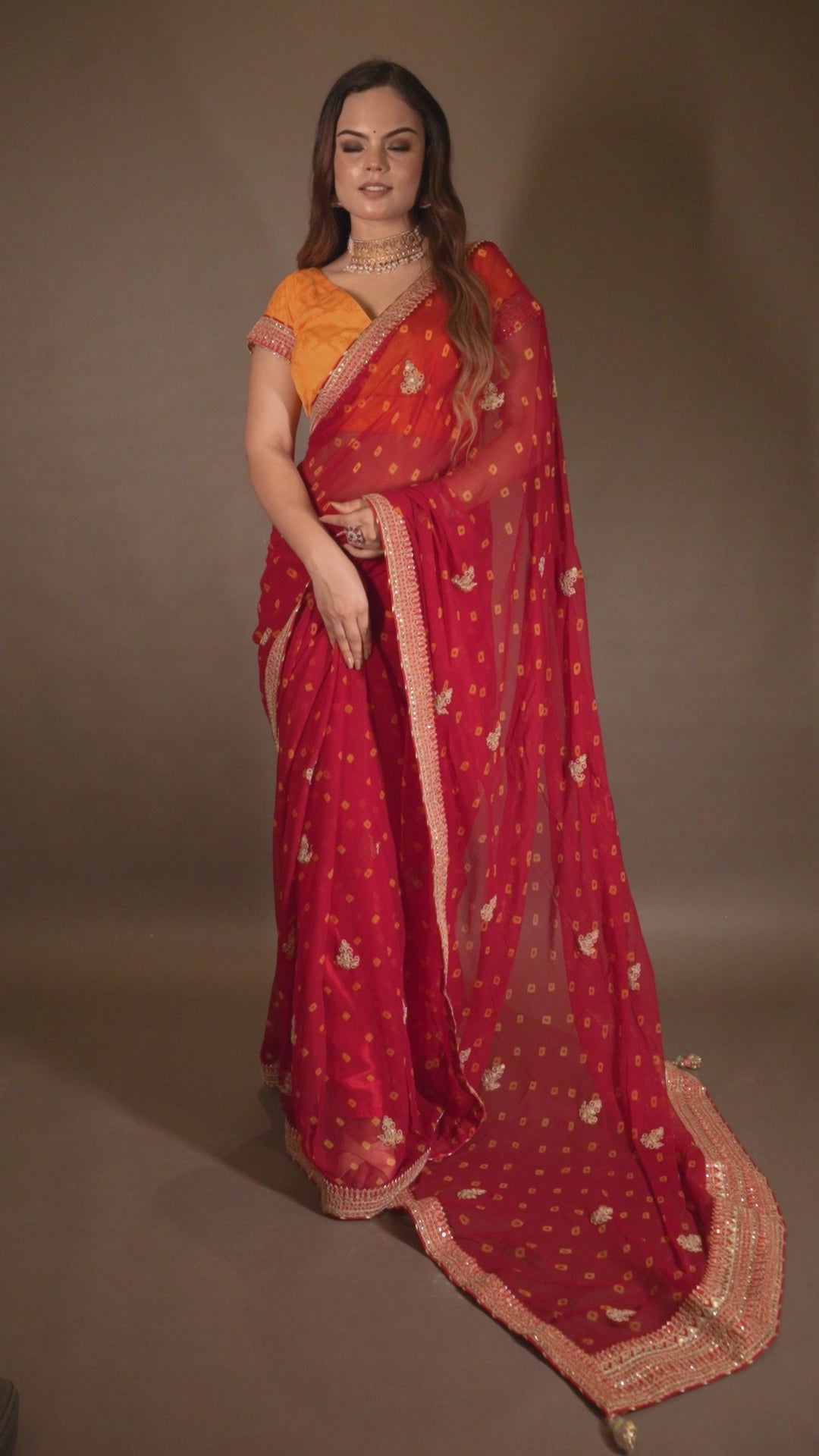 Red and Yellow Chiffon Saree with Gota Patti Border with Stitched Blouse