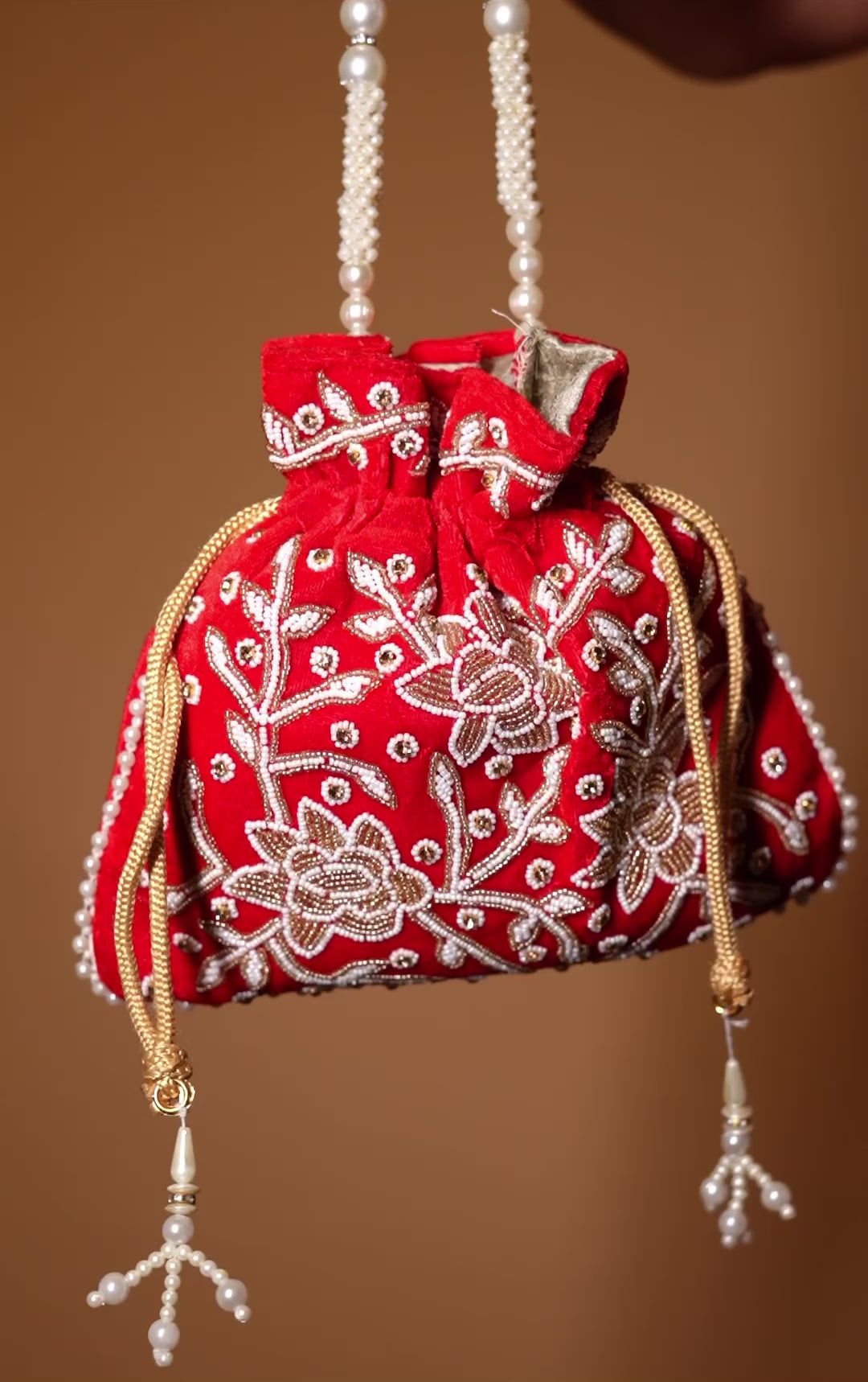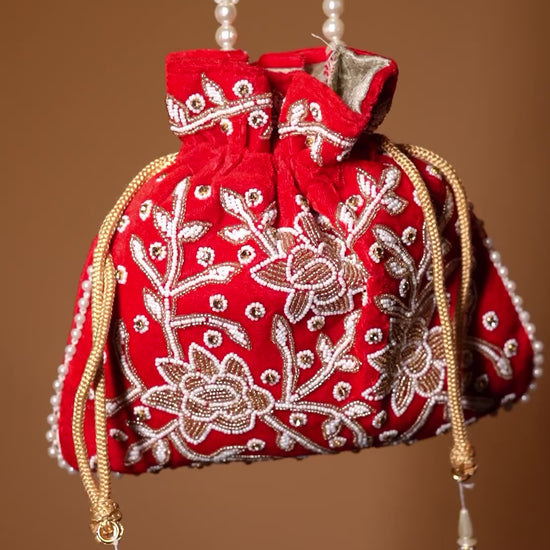 This exquisite Red Potli bag features handwork with pearls and beads that create a unique, luxurious design. The velvet base adds depth and richness to the overall look, while the pearl handle gives it an elegant finish. Perfect for adding a touch of glamour to any festive, party, or wedding outfit.