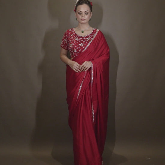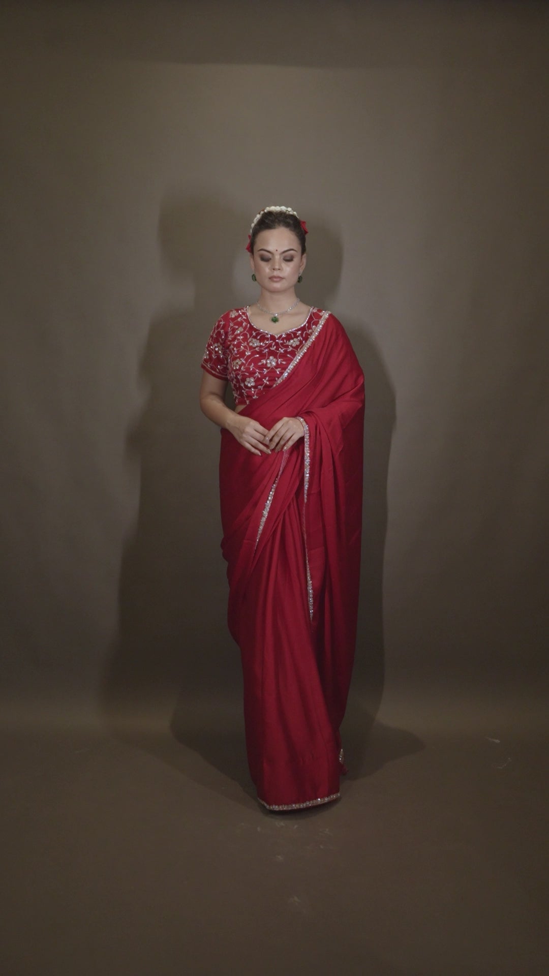 Turn heads with this bold red satin saree shimmering with fine Swarovski stones. The luxurious fabric and radiant embellishments add royal elegance to your festive wardrobe. Comes with a matching blouse that elevates your style effortlessly