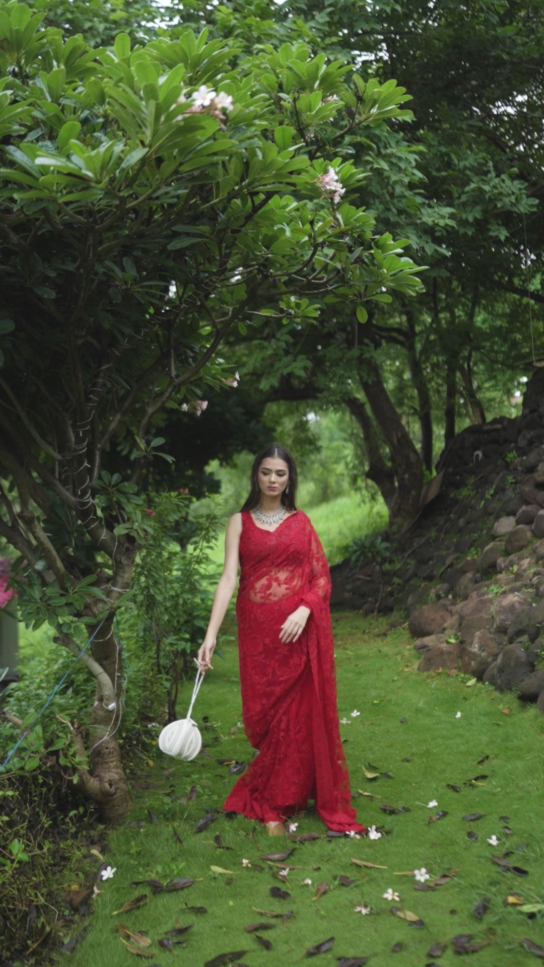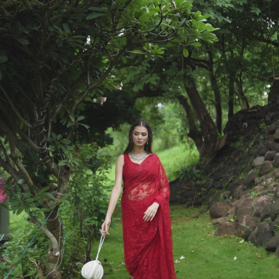 Step into elegance with this striking red super net saree adorned with detailed threadwork and sparkling Swarovski accents. The rich border adds grandeur to every drape. Comes with a stitched padded blouse for a flawless festive look