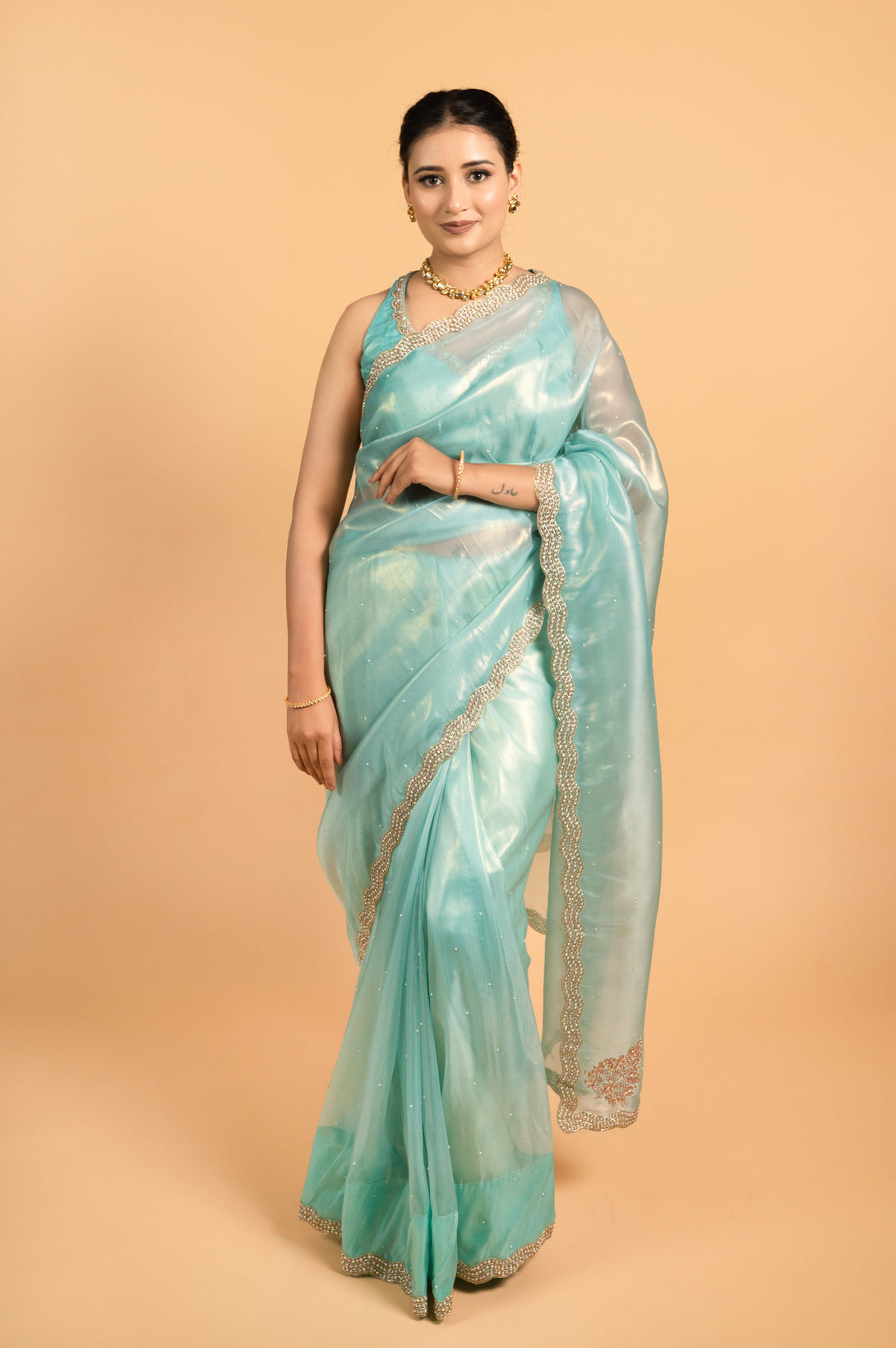 Elegant and luminous, this rose gold shimmer organza saree is exquisitely adorned with delicate pearl detailing and subtle sequin accents, adding a refined sparkle to its lightweight, flowing silhouette. Perfect for cocktail parties, receptions, or any special occasion where you want to shine with understated grace.