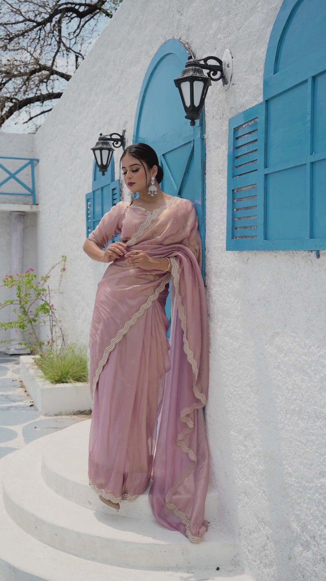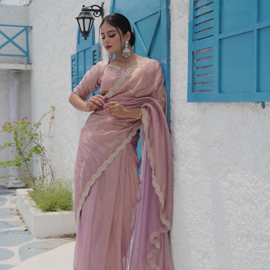 Rose Gold Shimmer Organza Saree with Pearl and Sequin Work