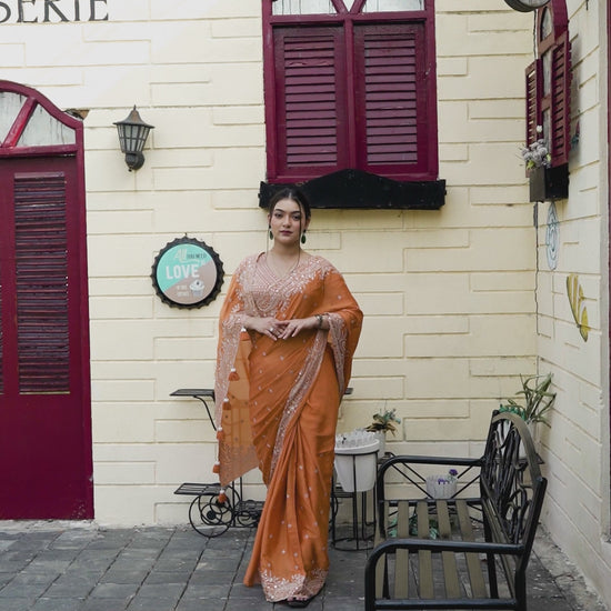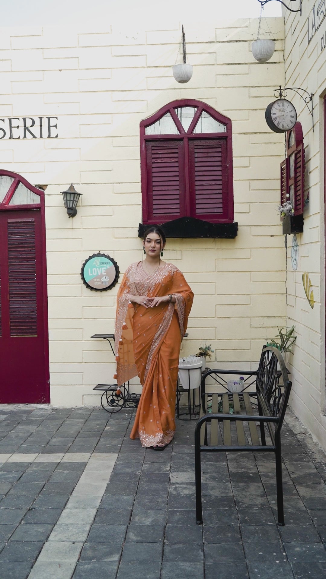 Highlights: Subtle sequin sparkle paired with elegant zari detailing makes this rust orange saree a striking choice for any celebration.