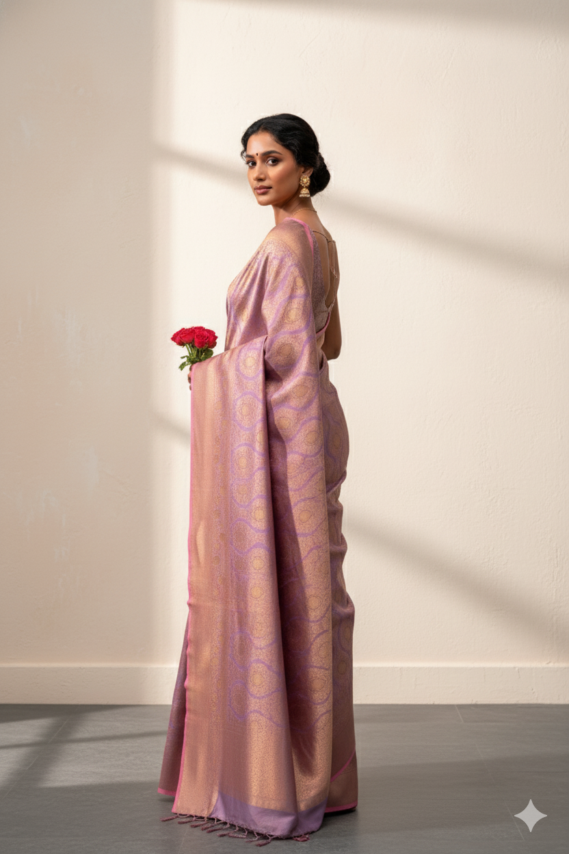 Soft and elegant, this two-tone peach handloom silk saree features intricate weaving artistry enhanced by a refined contrast selvage border. A perfect blend of heritage craftsmanship and modern sophistication, this drape is ideal for weddings, festive occasions, and cultural celebrations.