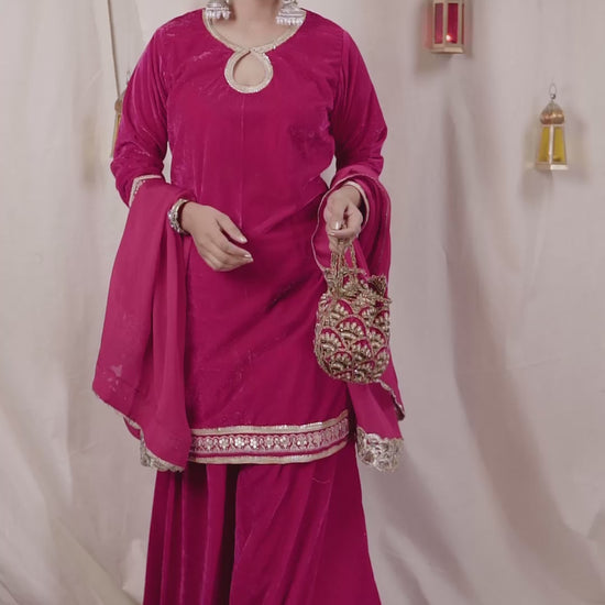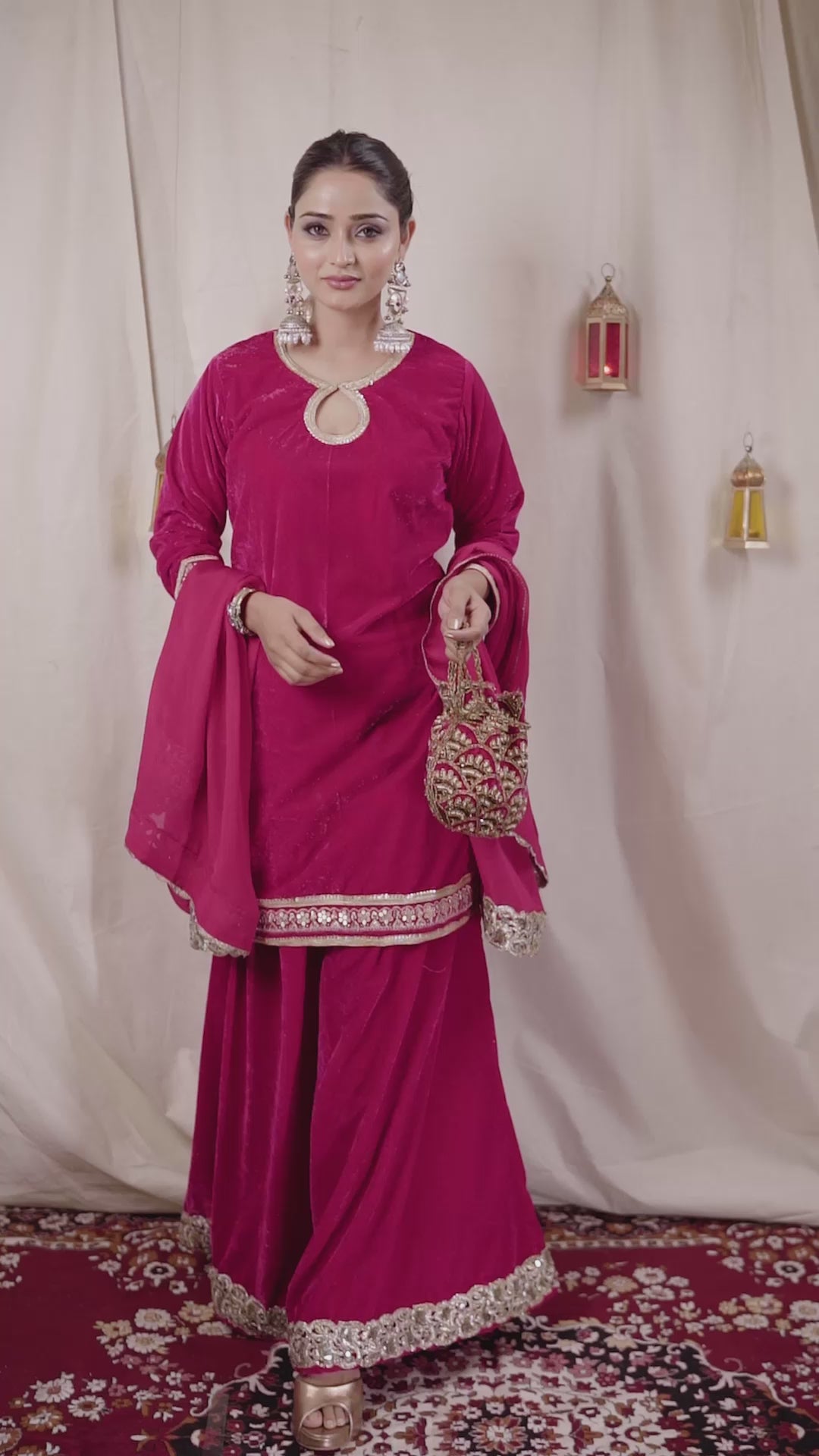Fuchsia Pink Velvet Shimmering Kurta Palazzo Pant Suit