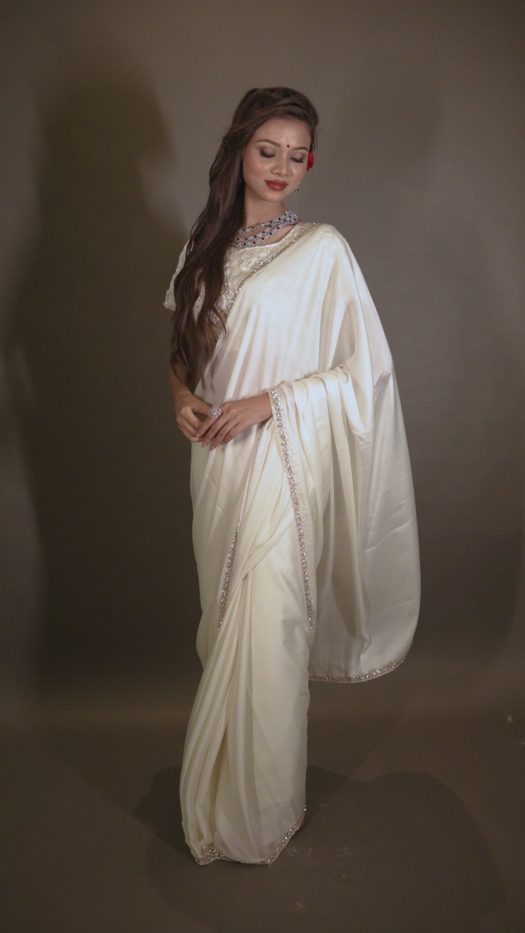 Ivory White Satin Saree Adorned with Small and Large Swarovski Stones, Paired with a Heavily Embellished Matching Blouse