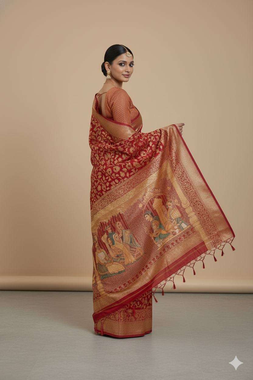 Plum Red Viscose Silk Saree with Exclusive Raja-Rani Prints