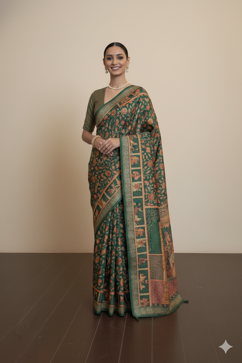 This exquisite Viscose Silk saree features exclusive Raja-Rani prints, blending regal artistry with modern luxury. The rich plum red color adds a touch of sophistication, making it a perfect choice for special occasions.