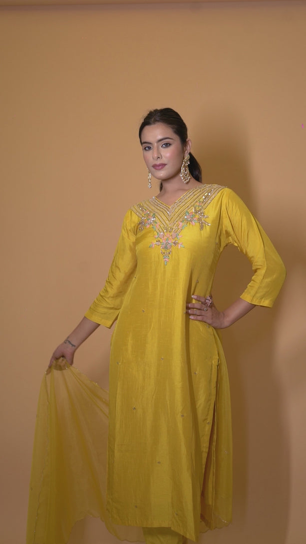 Yellow Silk Hand-Embroidered Suit with Organza Dupatta