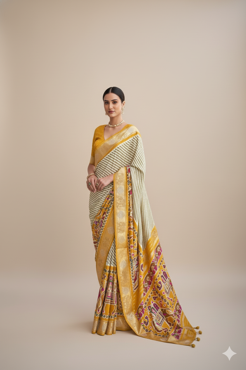 This luxurious yellow viscose silk saree features a vibrant multi-color golden border, exclusive Patola prints, and refined epoxy work, making it a perfect choice for creating sophisticated and timeless garments.